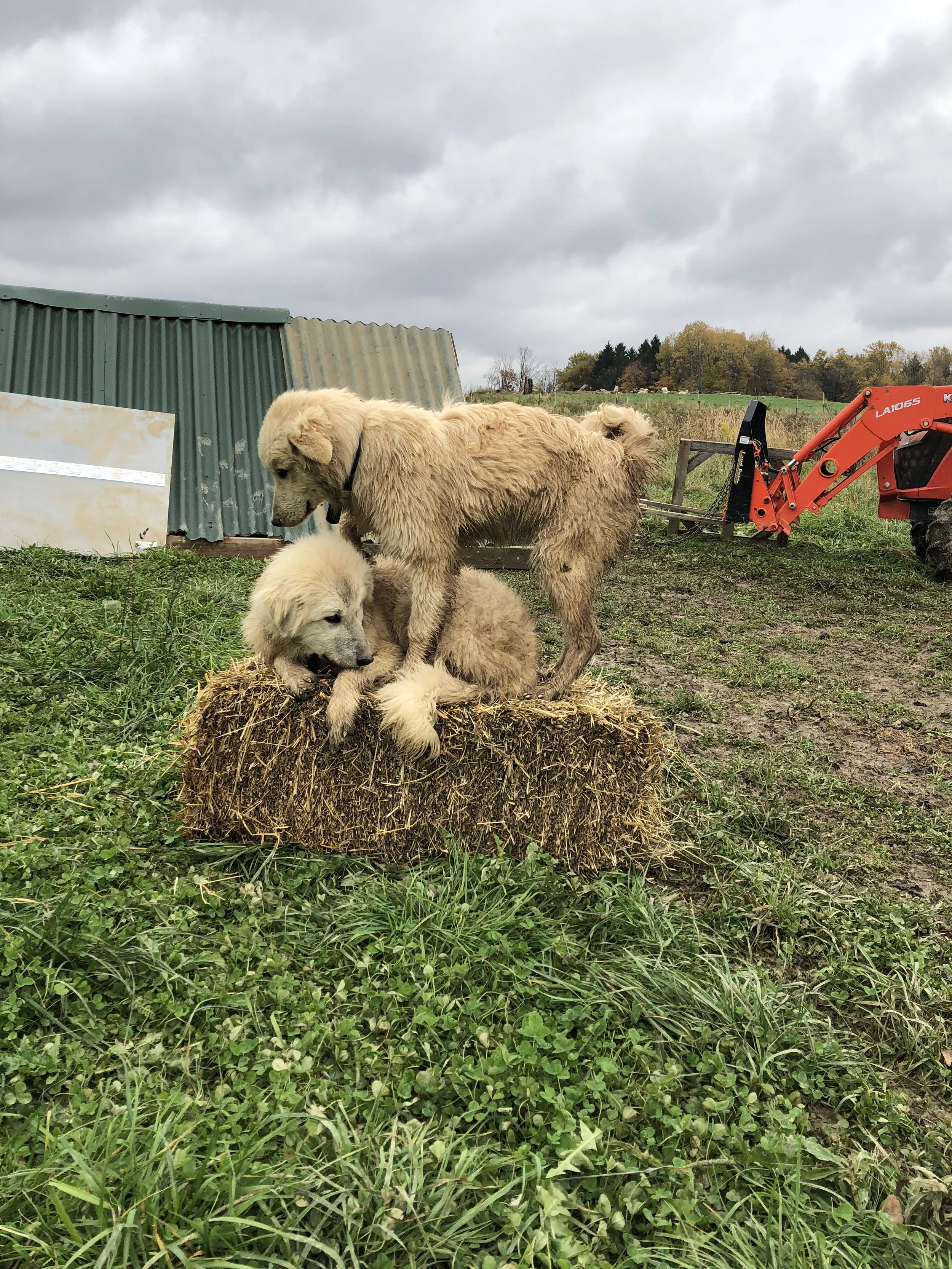 If you have visited the farm there is a good chance you witnessed the magic that is our livestock guardian dogs, June and Cash. Beautiful Colorado Mountain Dog litter mates that joined our flock in the fall of 2018 when they were just six months old. I didn’t know anything about LGDs at the time, but had a hunch that we needed some sort of protection in pasture for our sheep and chickens. I thankfully put my trust in a new friend, who serendipitously was a CMD breeder with an upcoming litter of pups due. I put a deposit down on a brother and sister pair site unseen, with the request that they spend some extra training under their breeder and dam, Luna to learn the basics of multi species protection, giving me a huge jump start to integrating them with our flock.